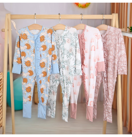 New Soft Baby Clothing Baby Boys Girls Jumpsuit Bamboo Viscose Spandex Custom Printed Sleepsuit Baby Ruffle Zipper Romper